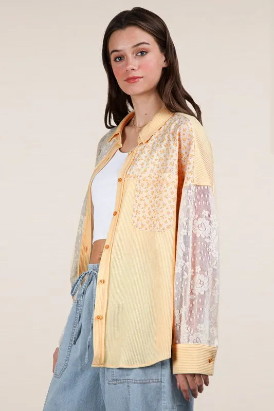 A contrast ribbed knit lace shacket combines the structure of a shirt with the comfort of a jacket, featuring ribbed knit detailing and delicate lace accents for a stylish twist. This versatile piece can be dressed up or down, making it perfect for layering over a variety of outfits. The contrasting textures add visual interest and a touch of sophistication to your look.
