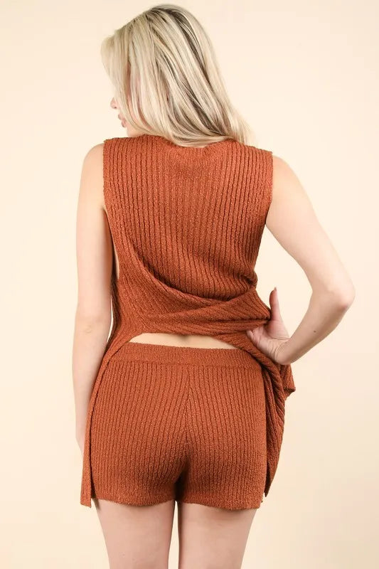 VERY J Slit Round Neck Top and Shorts Sweater Set