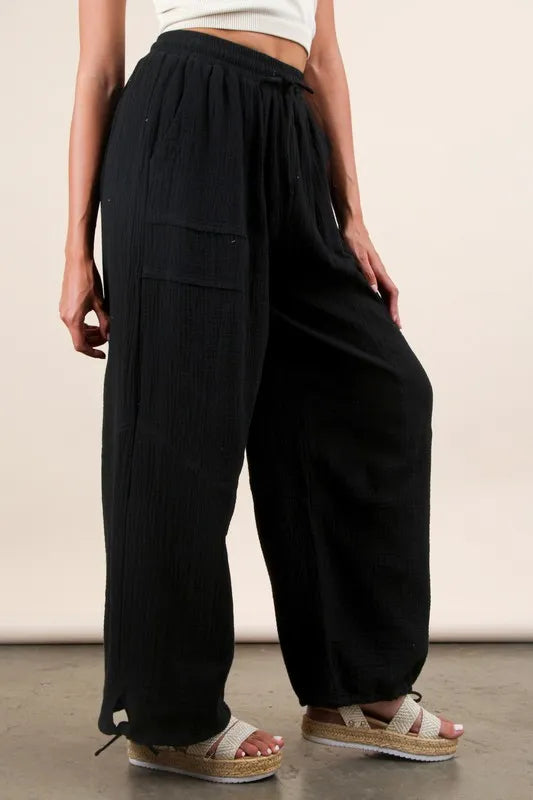 Wide leg gauze solid pants are loose-fitting trousers made from a lightweight and airy gauze fabric. With a wide leg silhouette, these pants offer a relaxed and comfortable fit while providing a breezy feel for warm weather. The solid color adds versatility, allowing these pants to be easily paired with various tops for a chic and effortless look.