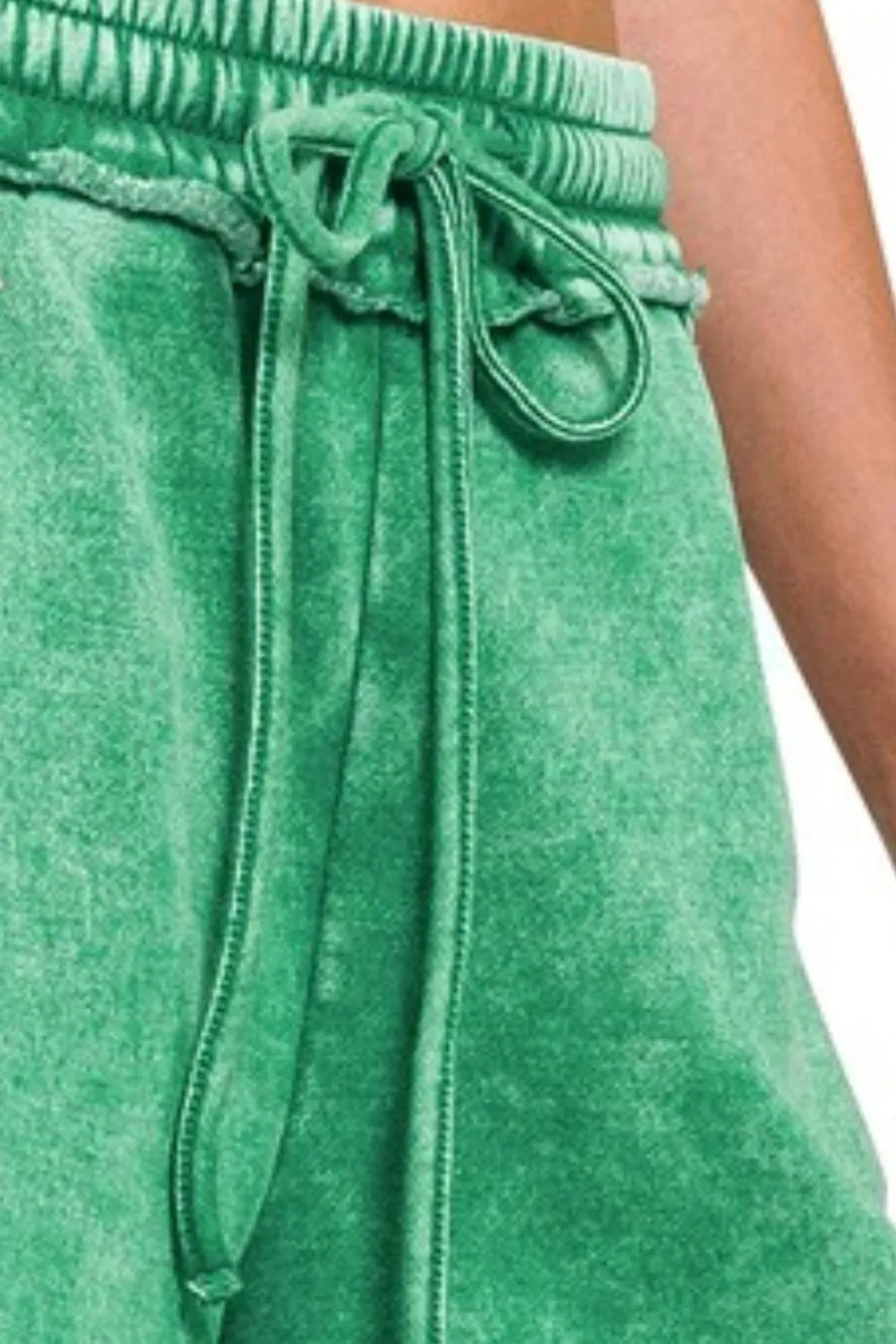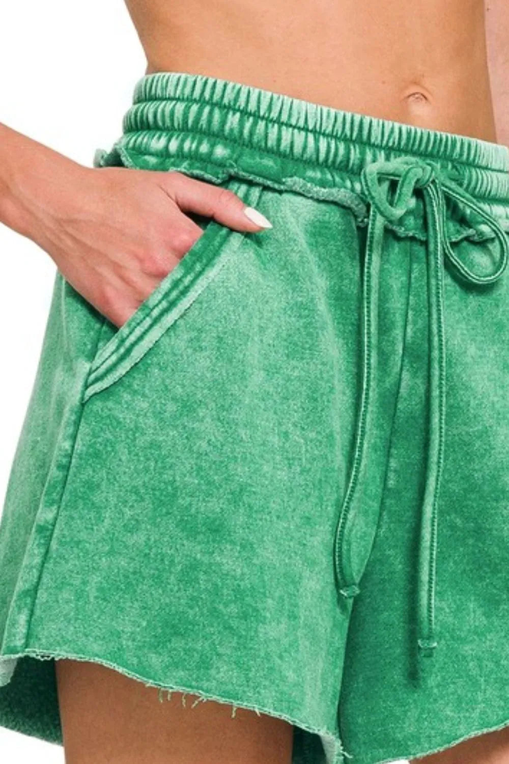These fashion vintage-washed French terry shorts feature a comfortable elastic waistband with drawstring closure for a customizable fit. Made from soft, breathable cotton-blend French terry fabric with a unique mineral wash treatment that gives each piece a distinctive faded appearance. The relaxed fit design offers freedom of movement while the raw hem edges add a casual, laid-back vibe. Practical side pockets provide convenient storage, making these shorts perfect for lounging, running errands, or casual summer outings. The mid-thigh length offers modest coverage while keeping you cool in warm weather.