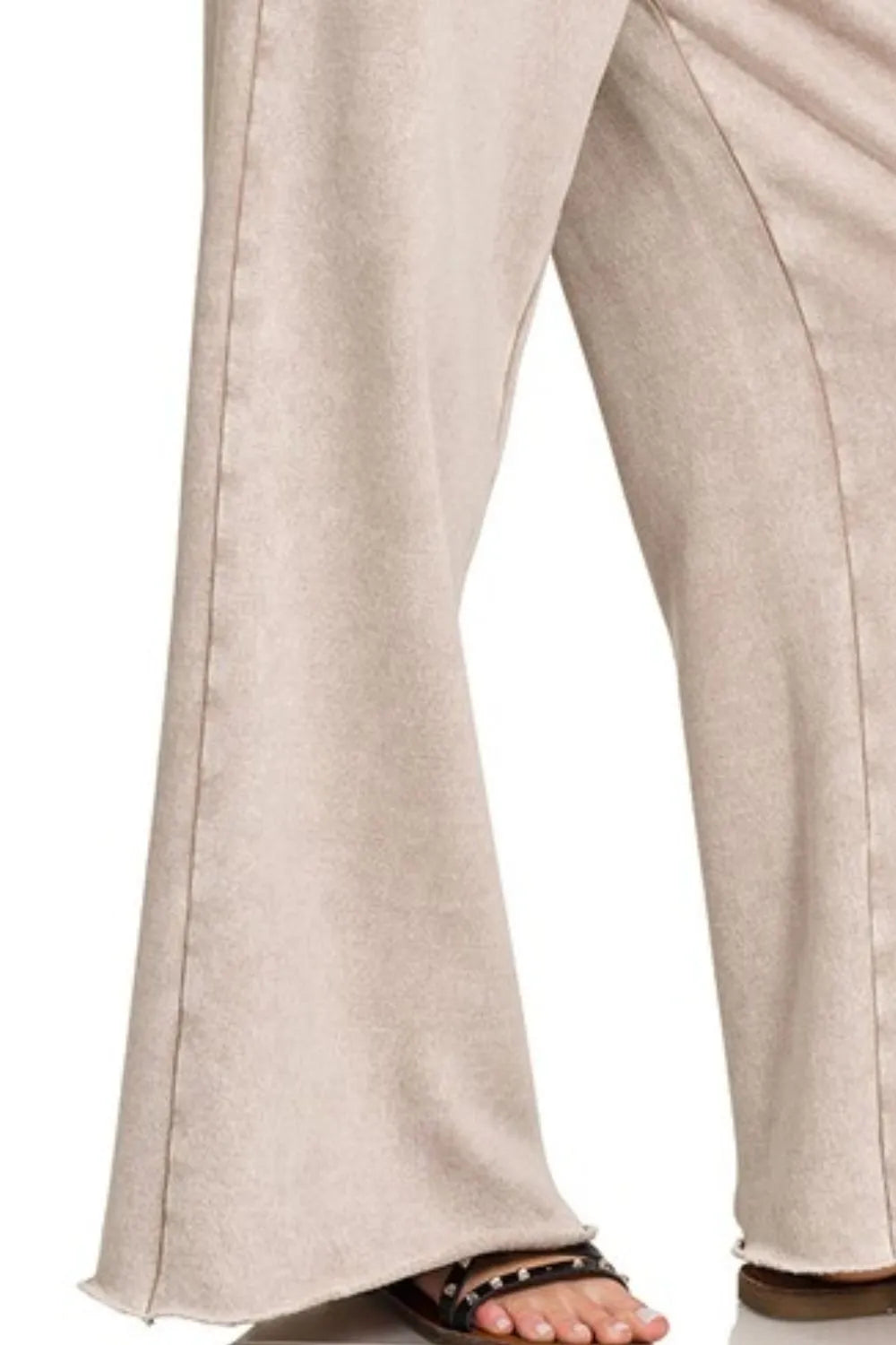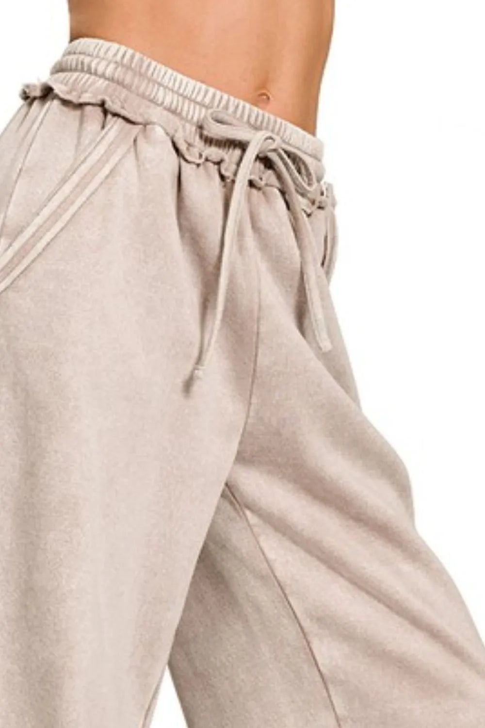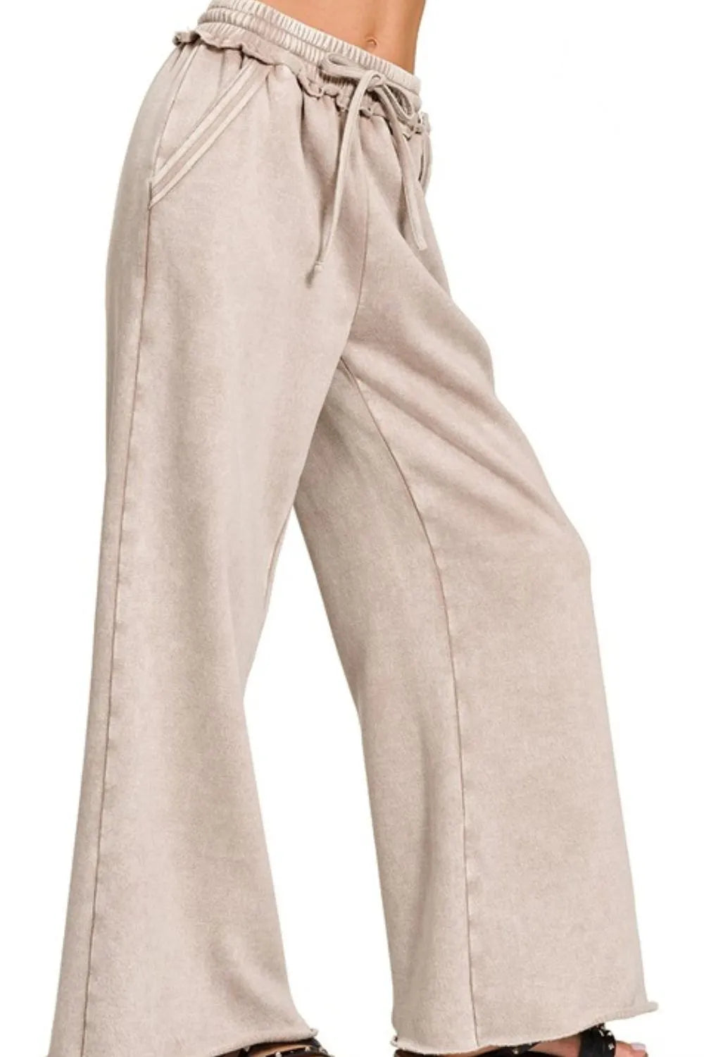 Acid wash fleece palazzo sweatpants with pockets are a trendy and comfortable twist on traditional sweatpants. The acid wash design gives these sweatpants a unique and edgy look, perfect for a casual and stylish outfit. The fleece material provides warmth and coziness, making these pants ideal for lounging or running errands on colder days. The palazzo silhouette features a wide leg that adds a fashionable touch to the classic sweatpant style. The addition of pockets adds functionality and convenience, allowing you to carry small essentials with you. These acid wash fleece palazzo sweatpants with pockets can be paired with a simple t-shirt or sweatshirt for a laid-back and on-trend look that combines comfort with fashion.