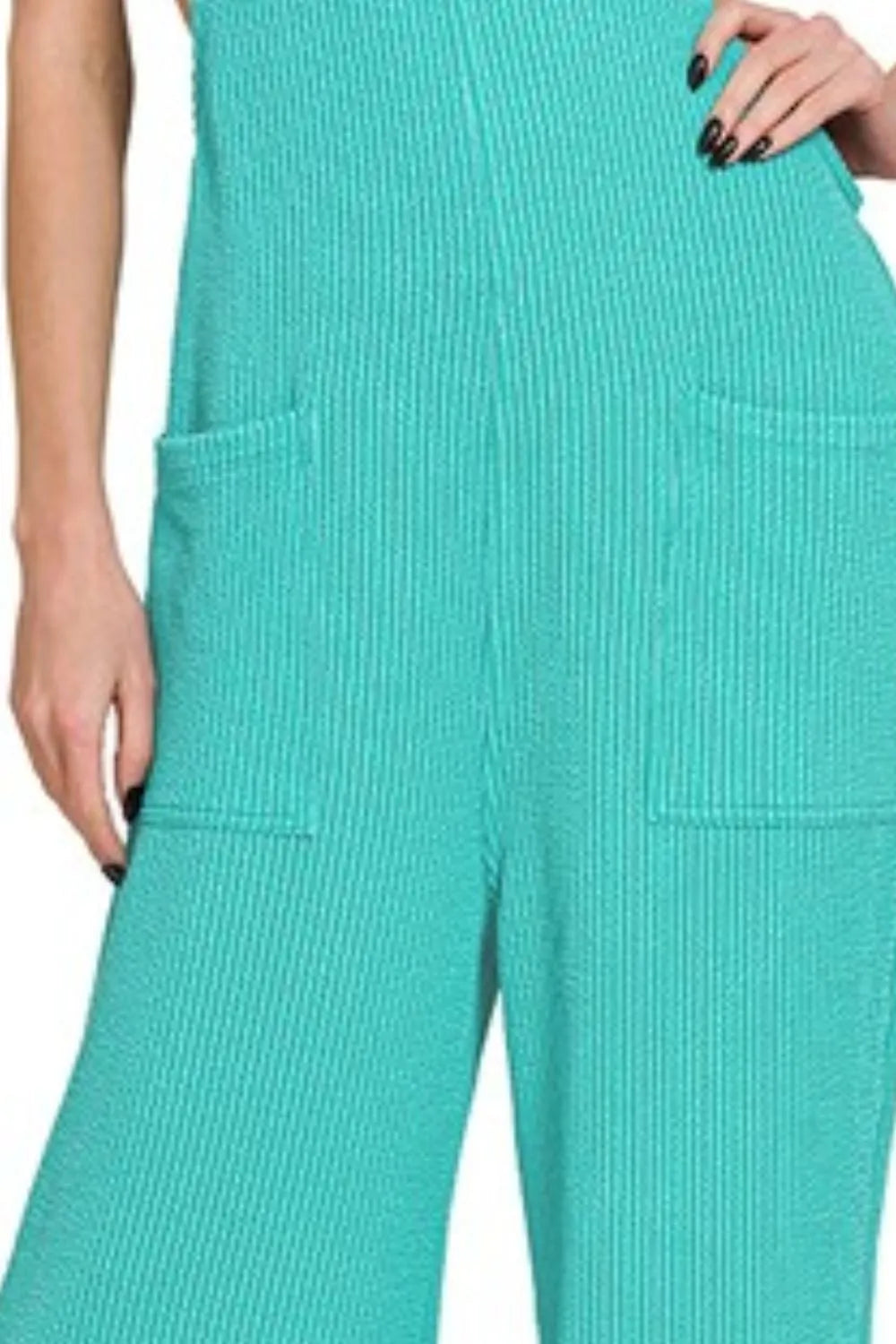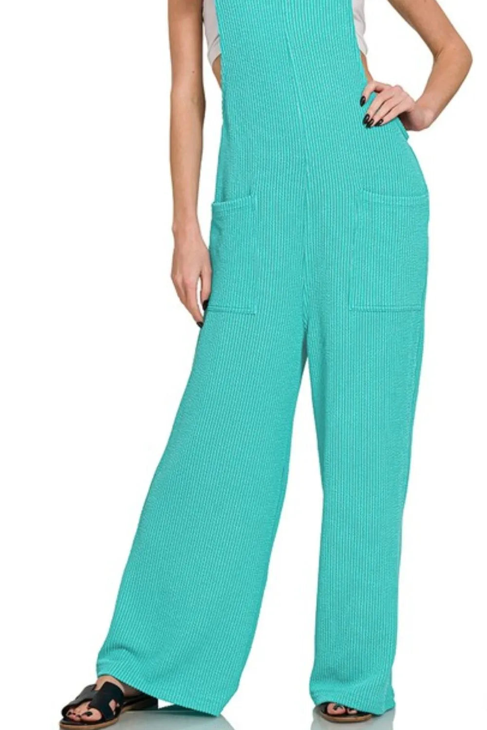 This fashionable ribbed jumpsuit features a relaxed wide-leg silhouette in a stunning turquoise shade. Made from soft, stretchy ribbed material that ensures all-day comfort. The design includes functional front pockets, adjustable shoulder straps with decorative buckles, and a flattering square neckline. The jumpsuit can be styled with a basic tee or tank underneath for versatile wear. Perfect for casual outings or loungewear, this piece combines style with comfort in a contemporary silhouette.