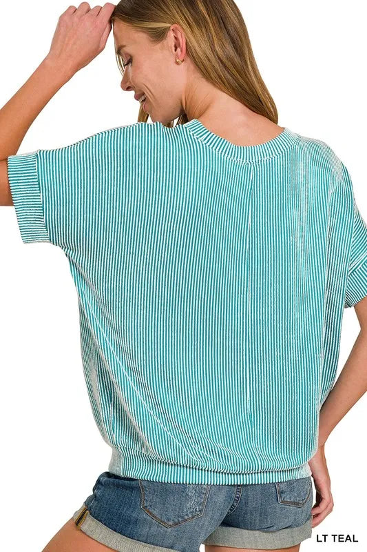 A Corded Rib Short Sleeve T-Shirt is a versatile and stylish top that features a textured corded ribbed fabric and short sleeves. The corded rib detailing adds visual interest and dimension to the t-shirt, creating a unique and trendy look. The short sleeves provide a casual and comfortable fit, making it suitable for everyday wear. This t-shirt can be dressed up with a skirt or trousers for a more polished outfit or paired with jeans for a relaxed and laid-back vibe. The Corded Rib Short Sleeve T-Shirt is a chic and versatile wardrobe staple that can be easily dressed up or down for various occasions.