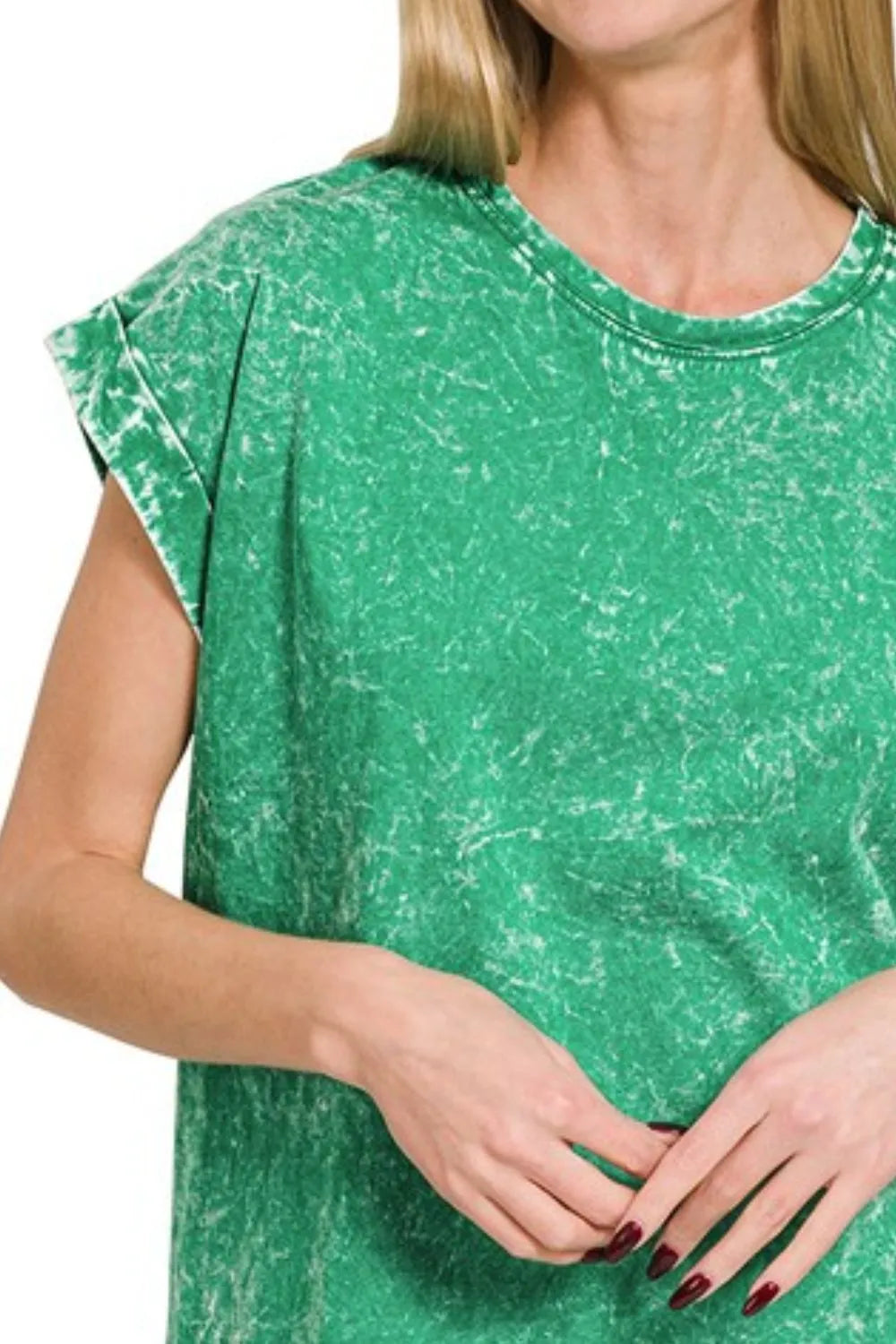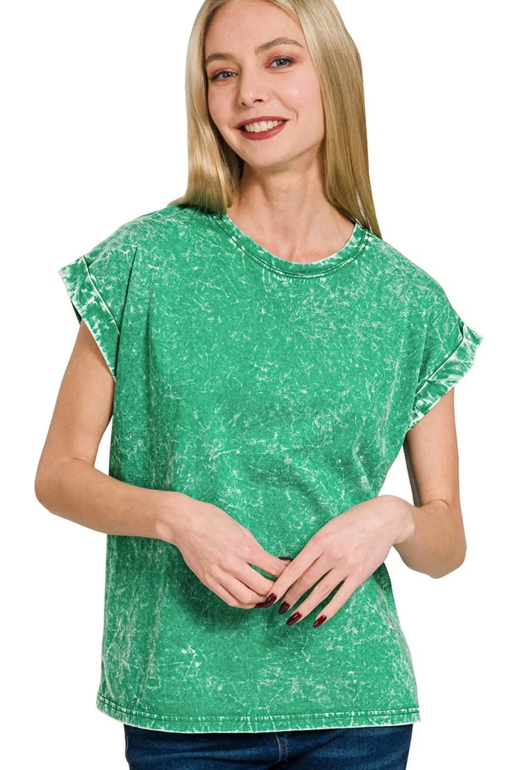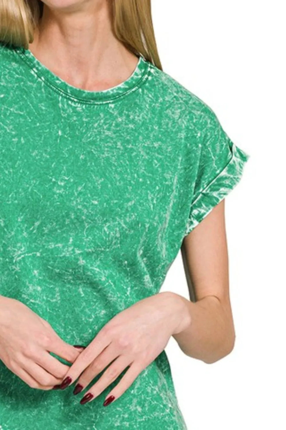 Zenana Crinkle Washed Round Neck Folded Short Sleeve Tee