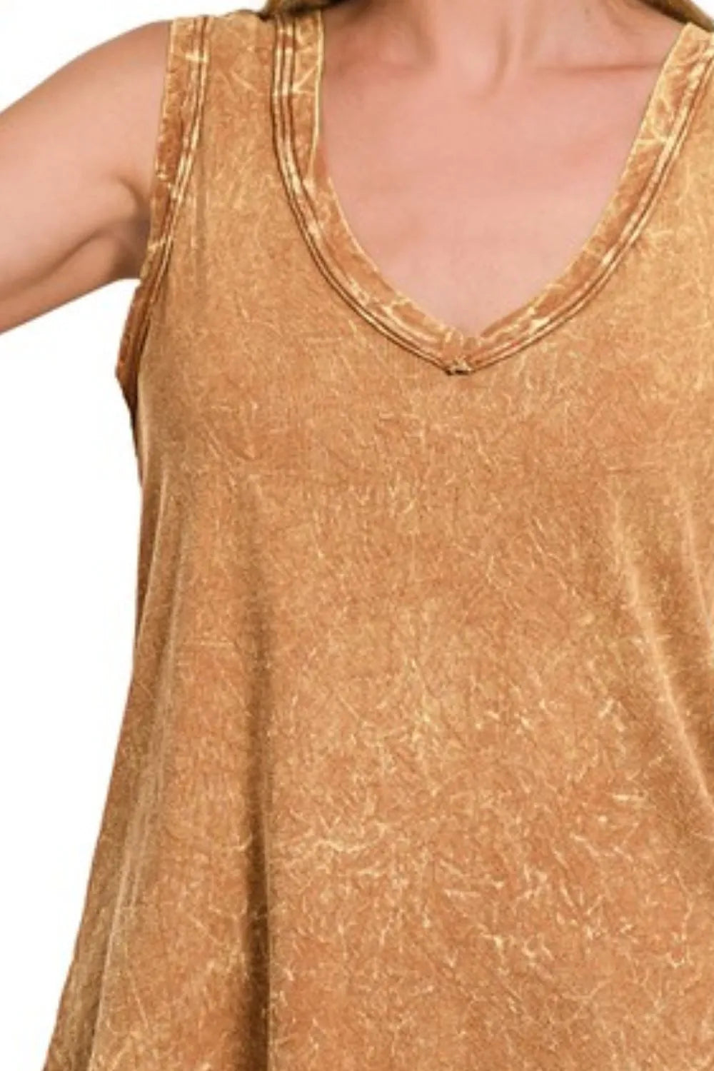 This stunning vintage-inspired tank top features a beautifully washed golden-brown fabric that offers both comfort and style. The V-neckline is adorned with intricate lace trim detailing, adding a feminine touch to this versatile piece. Made from soft, breathable material, this sleeveless top provides a relaxed, flowy fit that flatters all body types. Perfect for casual outings or dressed-up occasions, this tank can be paired with jeans, skirts, or layered under blazers. The vintage wash treatment gives each piece a unique, lived-in character while maintaining premium quality construction.