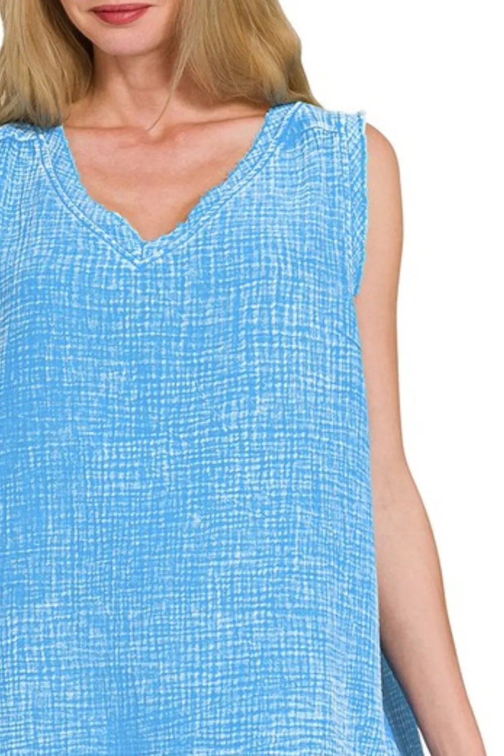 A Double Gauze Raw Edge Acid Washed Tank is a trendy and fashion-forward sleeveless top made from double gauze fabric with a raw edge finish and acid-washed treatment. This tank top has a lightweight and airy feel due to the double gauze material, making it ideal for warm weather or layering. The raw edge detailing adds a distressed and casual vibe to the tank, giving it a relaxed and edgy look. The acid-washed treatment creates a unique and vintage-inspired appearance with variations in color and texture. The Double Gauze Raw Edge Acid Washed Tank is a stylish and versatile piece that can be paired with shorts, jeans, or skirts for a chic and effortless outfit.