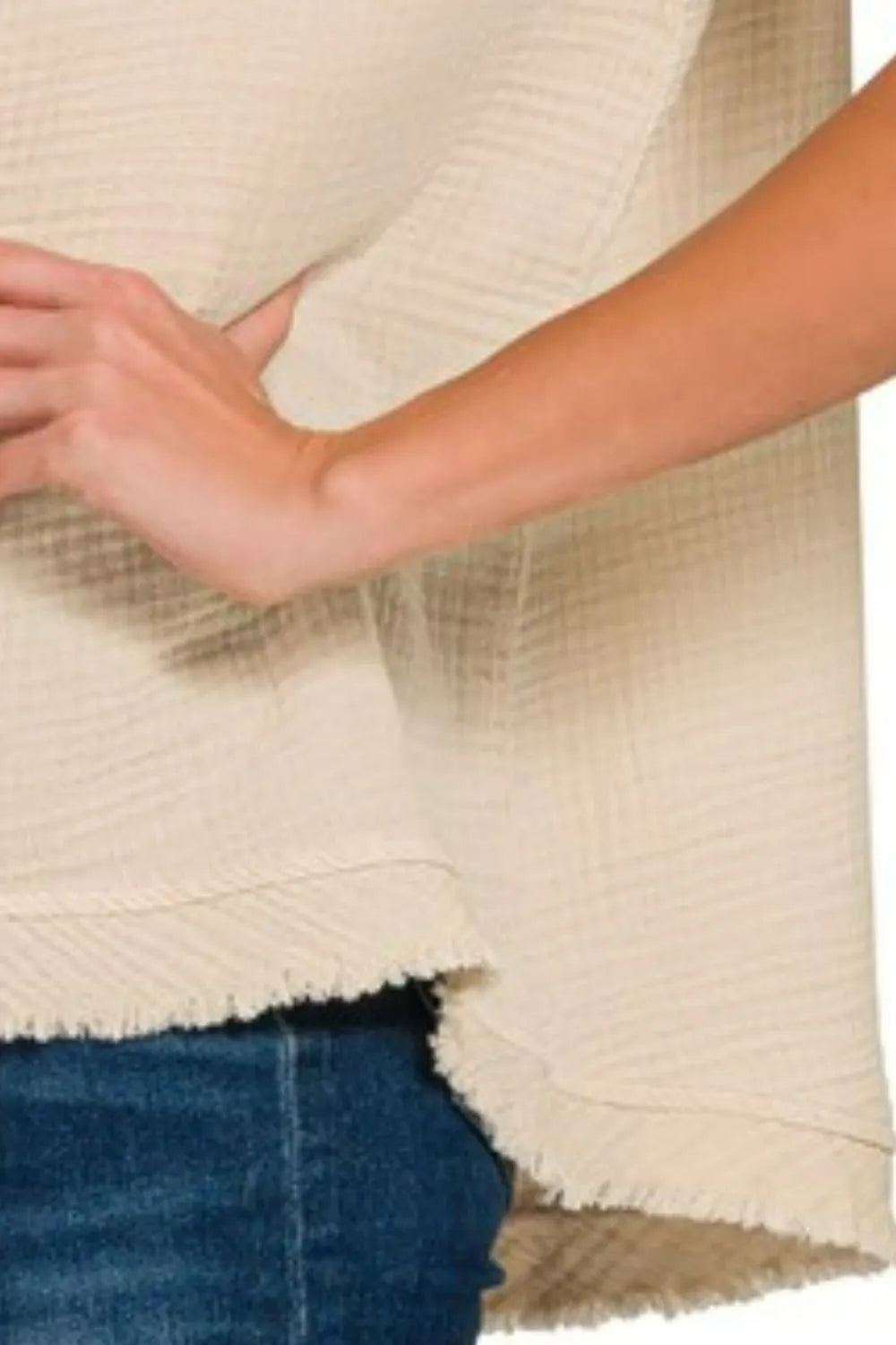 The Double Gauze Raw Edge V-Neck Tank is a stylish and versatile top that combines comfort with a casual yet chic design. Made from double gauze fabric, this tank top is soft, lightweight, and breathable, perfect for warm weather. The raw edge detailing adds a touch of texture and a laid-back vibe to the top. The V-neckline is flattering and feminine, making it a great option for layering or wearing on its own. This tank top can be easily paired with shorts, jeans, or skirts for a relaxed and effortless look. Whether for a casual outing or a day at the beach, the Double Gauze Raw Edge V-Neck Tank is a must-have wardrobe staple for its comfort and versatility.