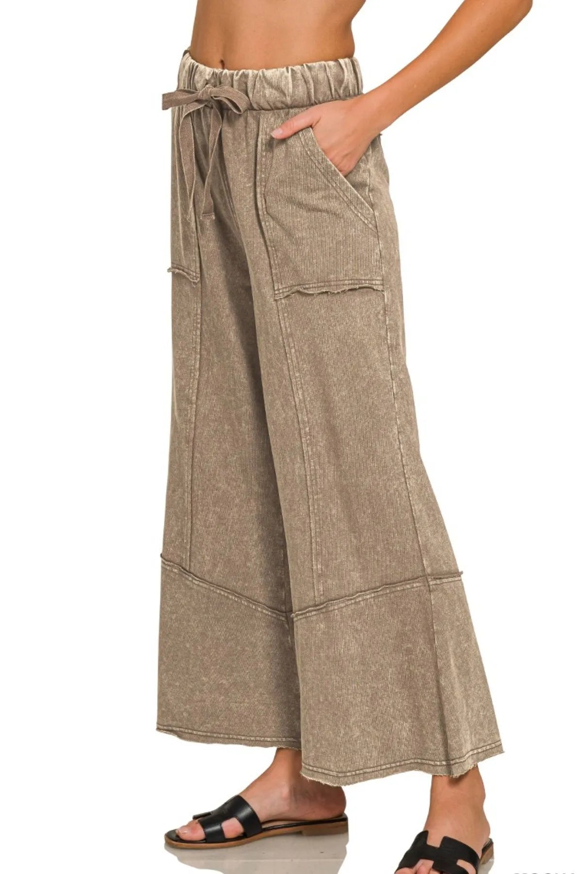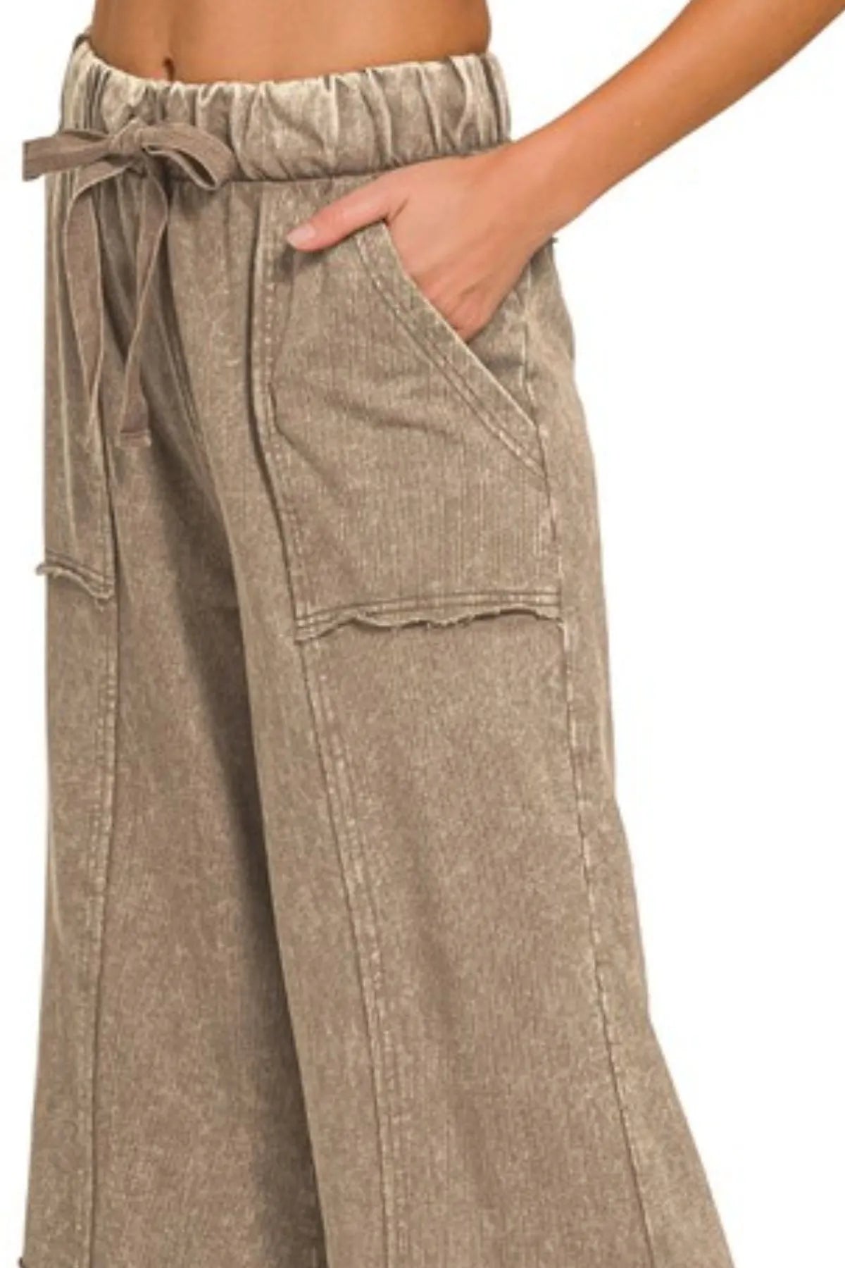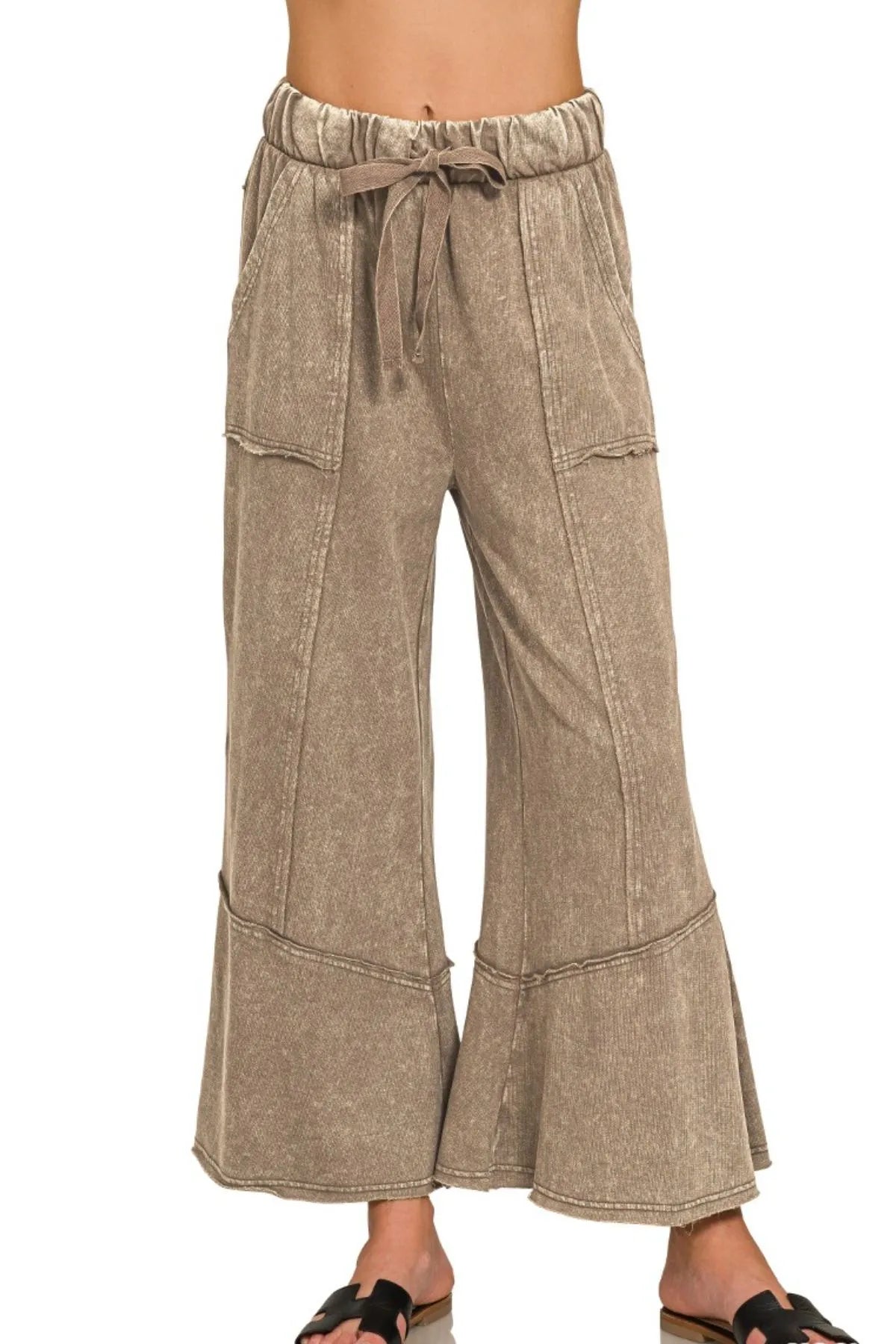 These stylish bell bottom pants feature a comfortable elastic waistband with an adjustable drawstring for the perfect fit. Made from a quality cotton blend fabric with a vintage wash treatment that gives them a lived-in look. The relaxed silhouette through the thighs transitions into a dramatic flared bell bottom hem, creating a flattering retro-inspired shape. Front patch pockets add functionality while the high-rise waist and ankle length make these pants incredibly versatile for casual everyday wear. The neutral khaki color and washed effect make these pants easy to style with various tops and shoes.