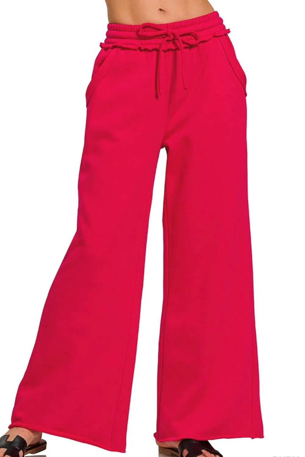 "Fleece Exposed Seam Wide Leg Sweatpants" are wide-leg sweatpants made of soft fleece fabric for comfort and warmth. The exposed seam design adds a touch of style and personality. Perfect for pairing with casual tops to showcase a relaxed and laid-back fashion look in everyday life.
