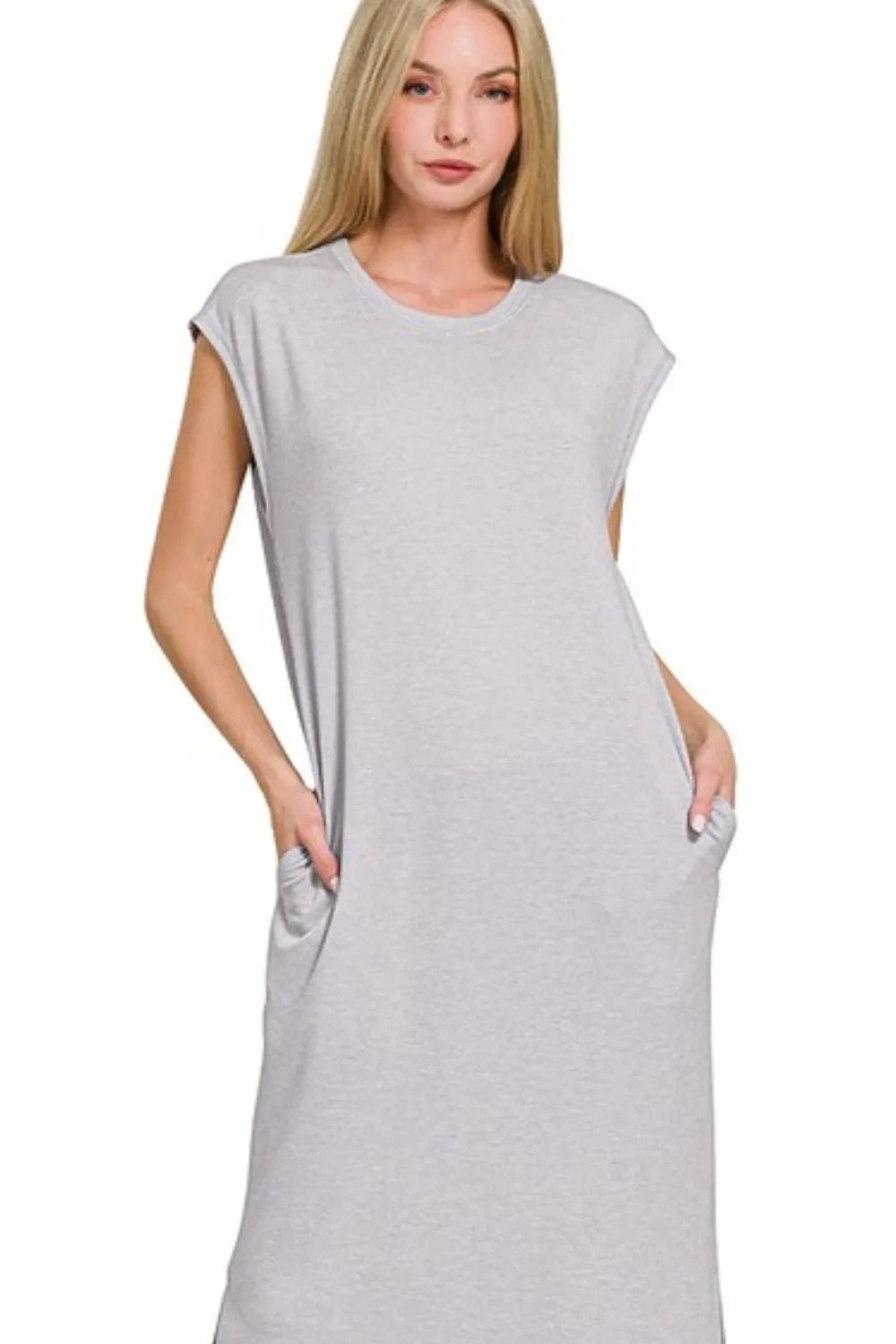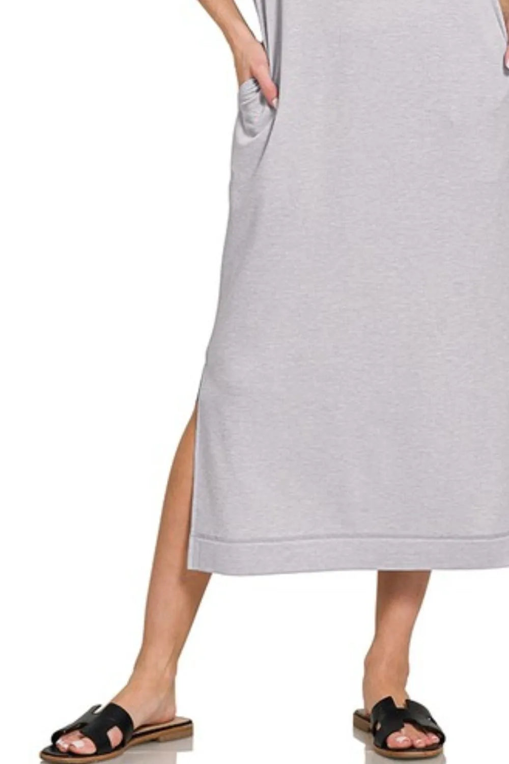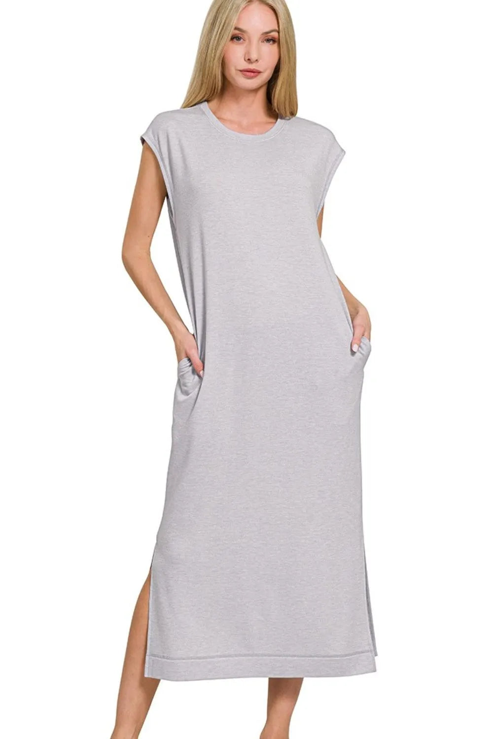 This casual midi dress features a comfortable heathered jersey construction in a beautiful sage green shade. The relaxed fit silhouette includes practical side slits and cap sleeves for ease of movement. Made from a soft, breathable knit fabric that's perfect for all-day wear. The versatile design can be dressed up or down, making it ideal for various occasions from casual outings to weekend brunches. The midi length and round neckline create a balanced, flattering look suitable for many body types.