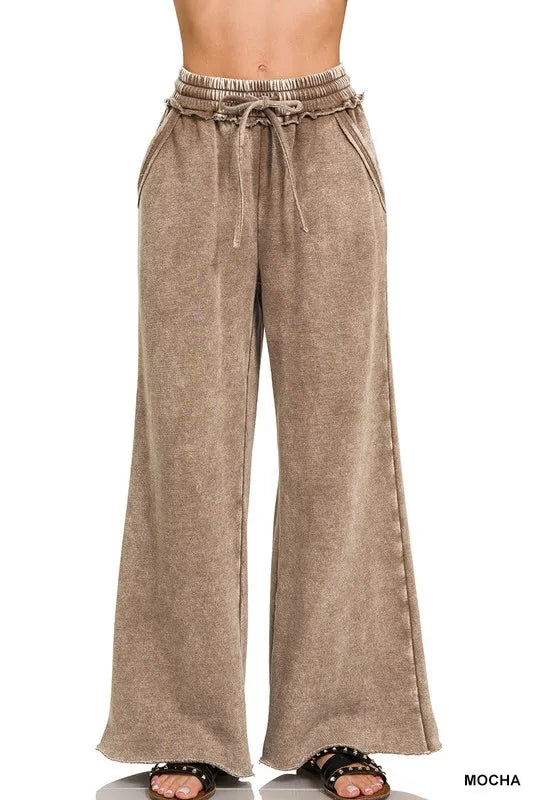 Acid wash fleece palazzo sweatpants with pockets are a trendy and comfortable twist on traditional sweatpants. The acid wash design gives these sweatpants a unique and edgy look, perfect for a casual and stylish outfit. The fleece material provides warmth and coziness, making these pants ideal for lounging or running errands on colder days. The palazzo silhouette features a wide leg that adds a fashionable touch to the classic sweatpant style. The addition of pockets adds functionality and convenience, allowing you to carry small essentials with you. These acid wash fleece palazzo sweatpants with pockets can be paired with a simple t-shirt or sweatshirt for a laid-back and on-trend look that combines comfort with fashion.