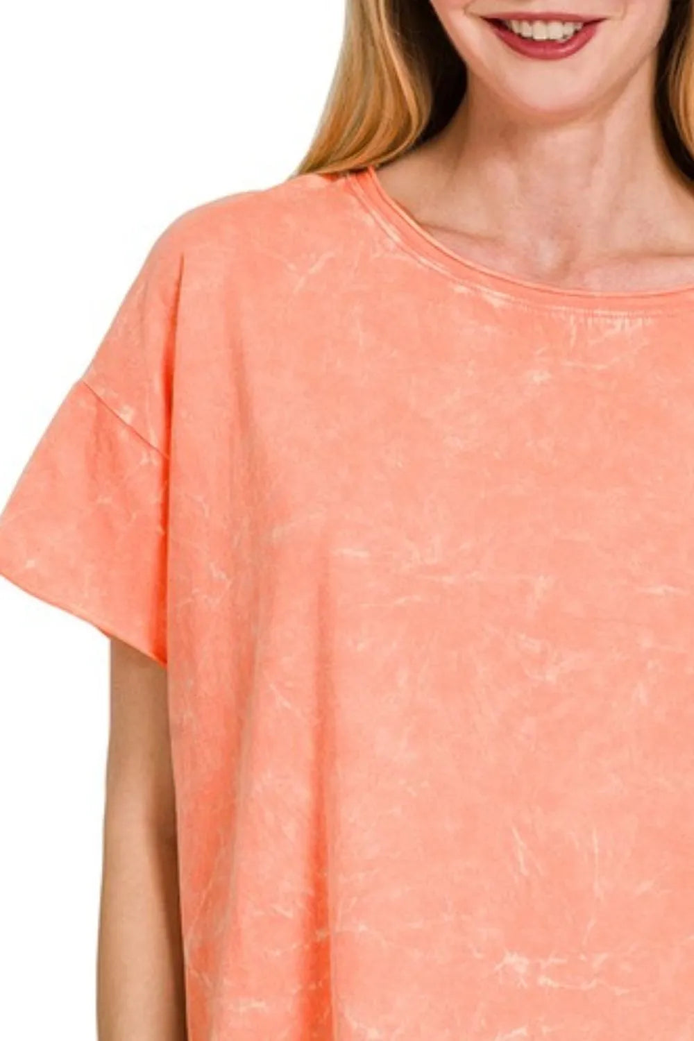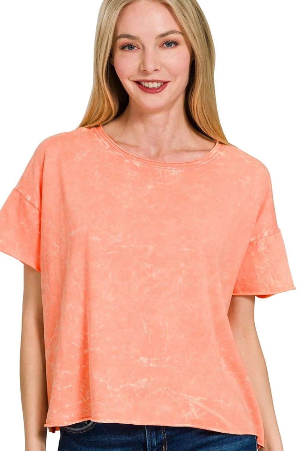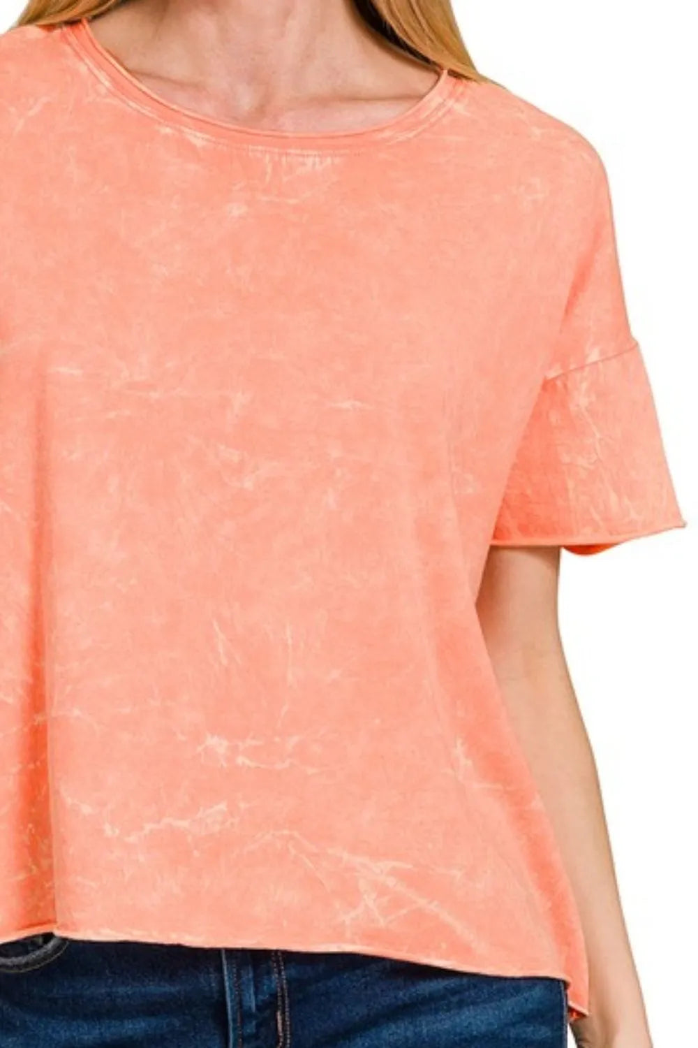 This stylish mineral wash t-shirt features a fashion cropped silhouette in a refreshing mint color. Made from a soft cotton blend material that ensures breathability and comfort. The unique mineral wash treatment creates an eye-catching texture and pattern that adds visual interest. The relaxed fit and round neckline make it perfect for casual wear, while the cropped length adds a modern touch. Ideal for pairing with high-waisted jeans, shorts, or skirts. The short sleeves and lightweight fabric make it an excellent choice for warm weather.