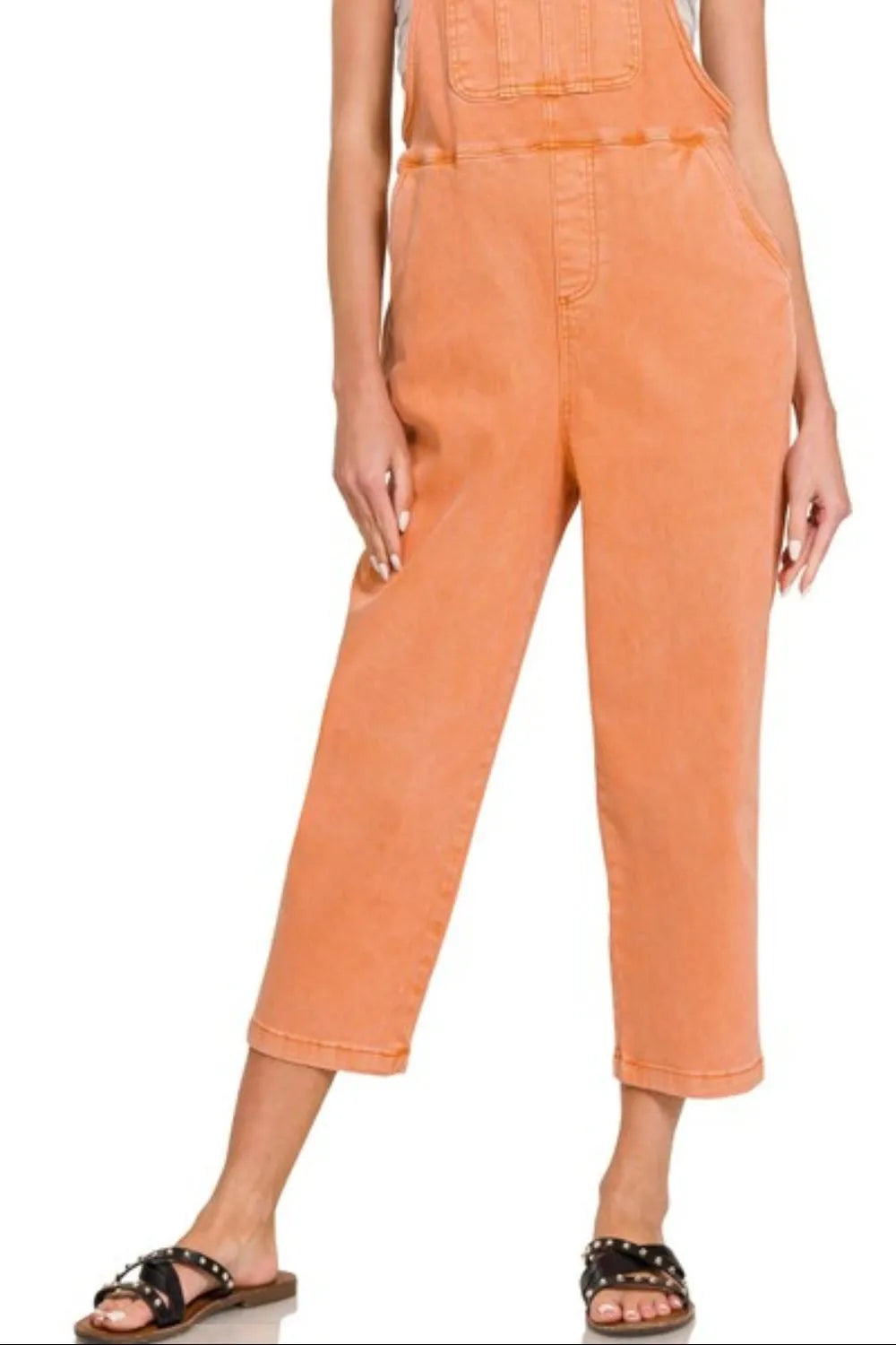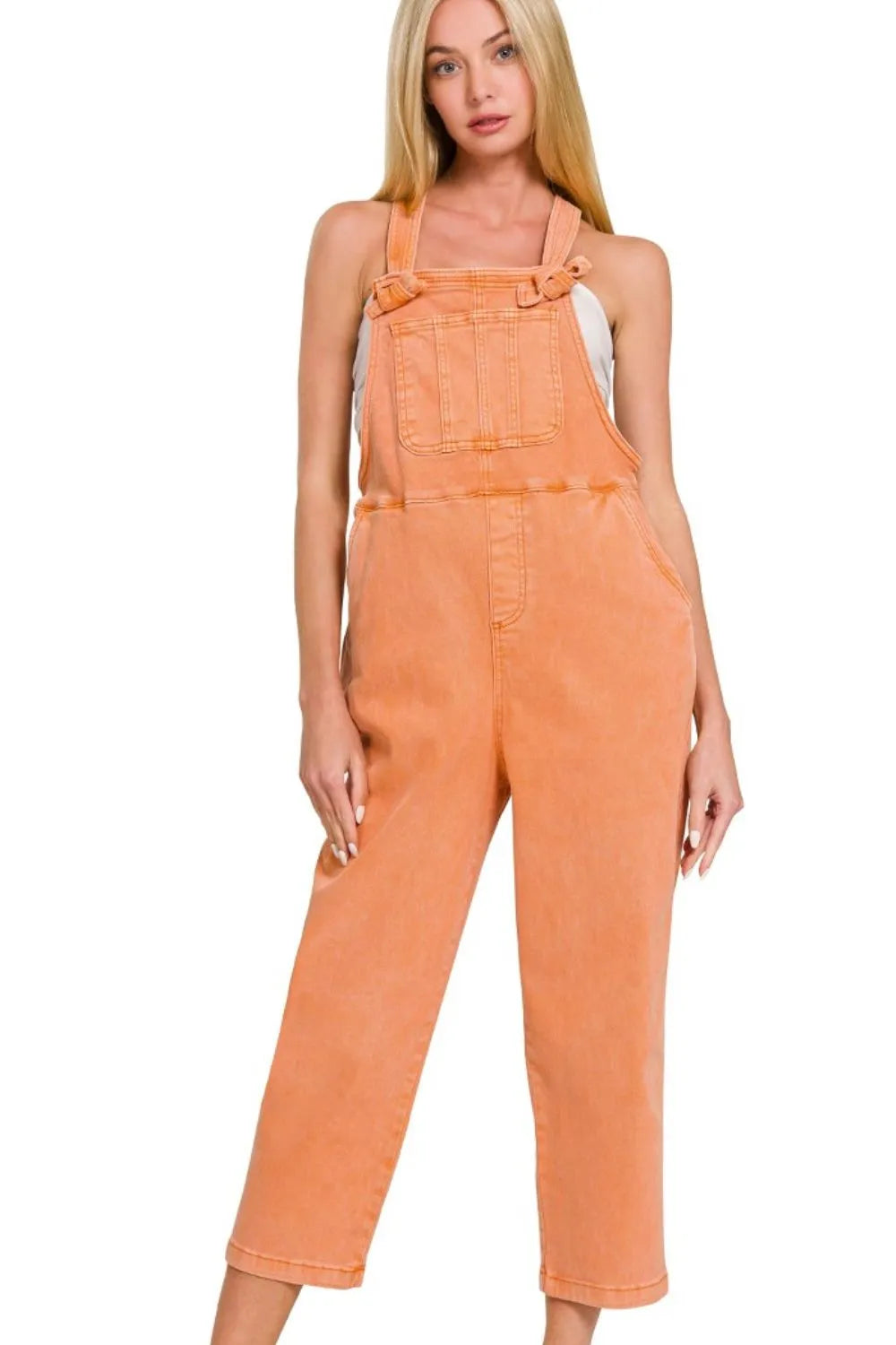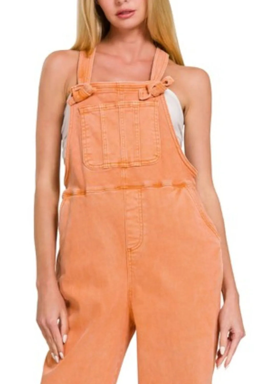 These fashion orange denim overalls feature a relaxed, comfortable fit crafted from soft washed denim fabric. The adjustable shoulder straps with metal buckle hardware allow for customizable sizing, while the bib front design includes a functional chest pocket. The cropped ankle-length cut offers modern styling perfect for showcasing footwear. Side button closures provide easy on/off access, and the vintage wash treatment gives each piece unique character. Ideal for casual weekend wear, festival outfits, or layering over tees and crop tops for effortless street style.