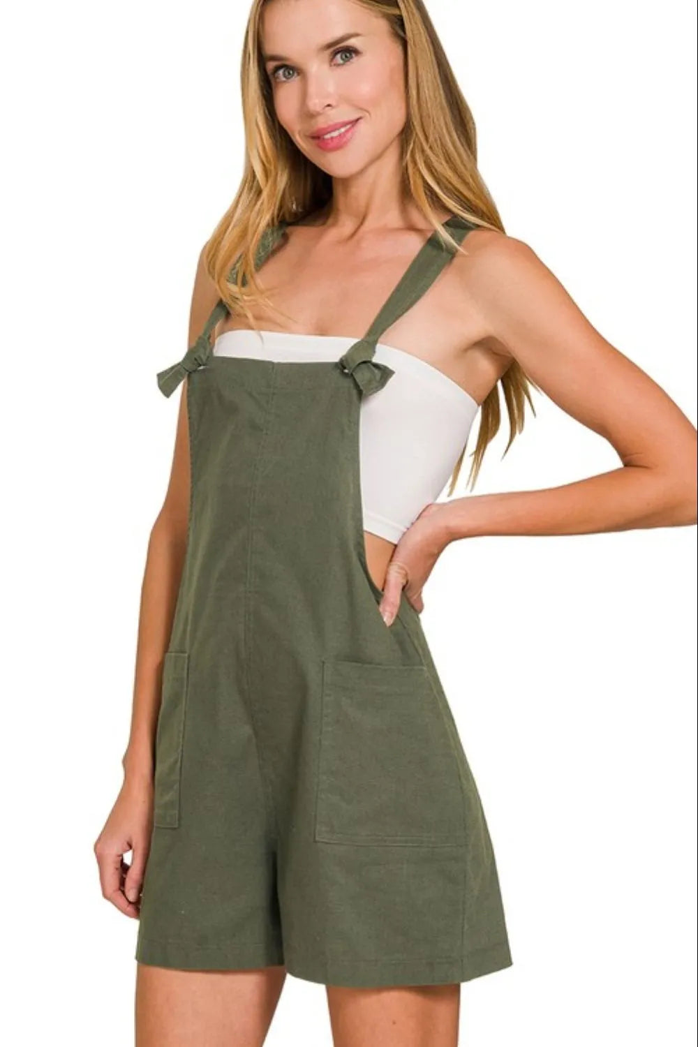This fashion overall shorts romper combines comfort and style perfectly. Made from breathable linen-blend fabric, it features charming bow details on the straps and convenient front pockets. The olive green color offers versatile styling options while the relaxed fit ensures all-day comfort. The adjustable straps allow for a customized fit, and the shorts length makes it ideal for warm weather. Perfect for casual outings, beach days, or weekend brunches. The durable construction and quality stitching ensure long-lasting wear.